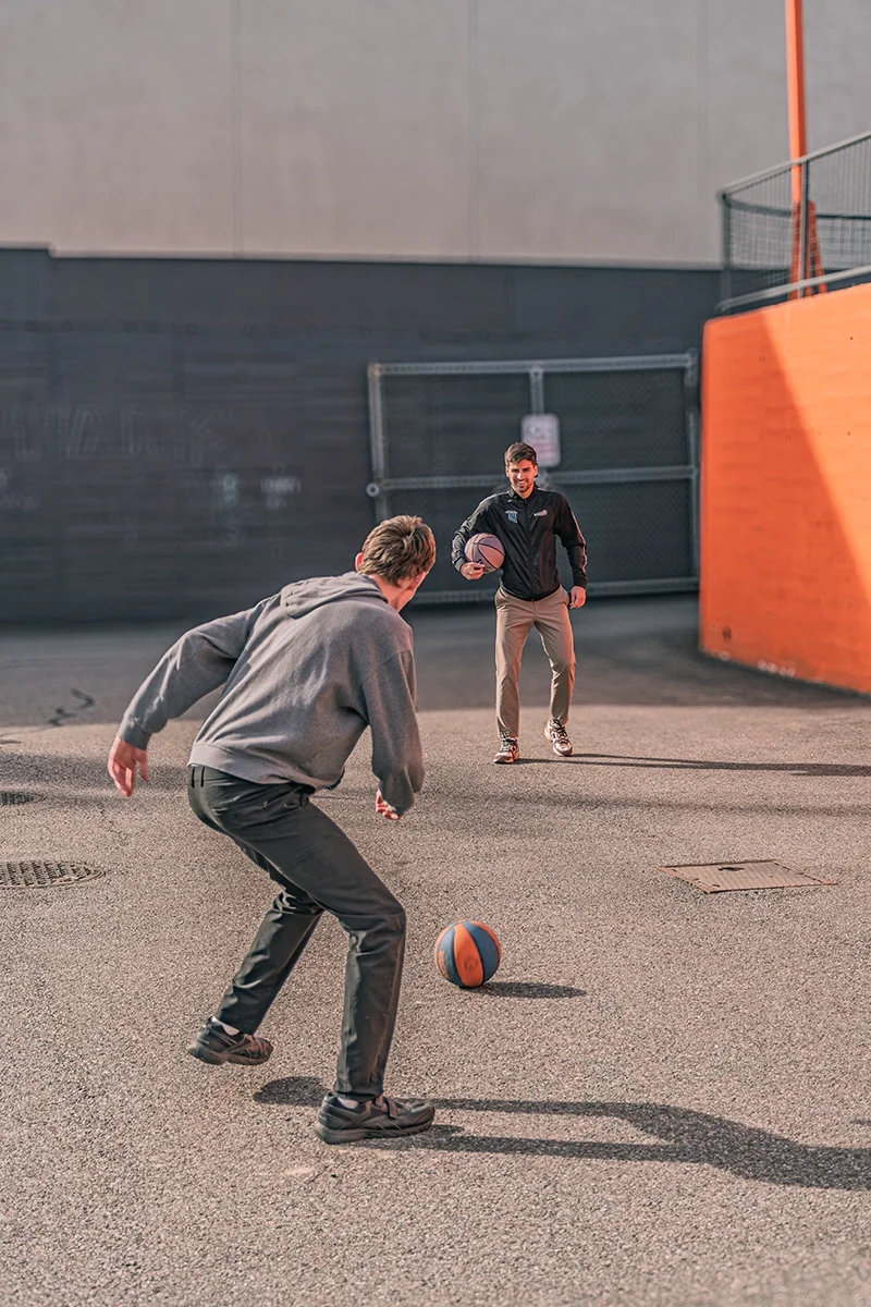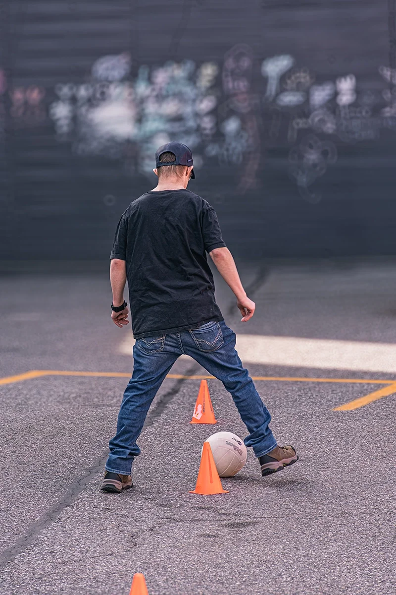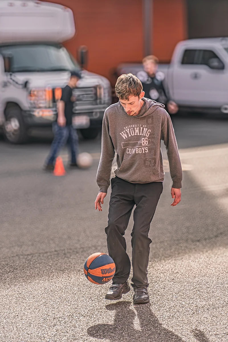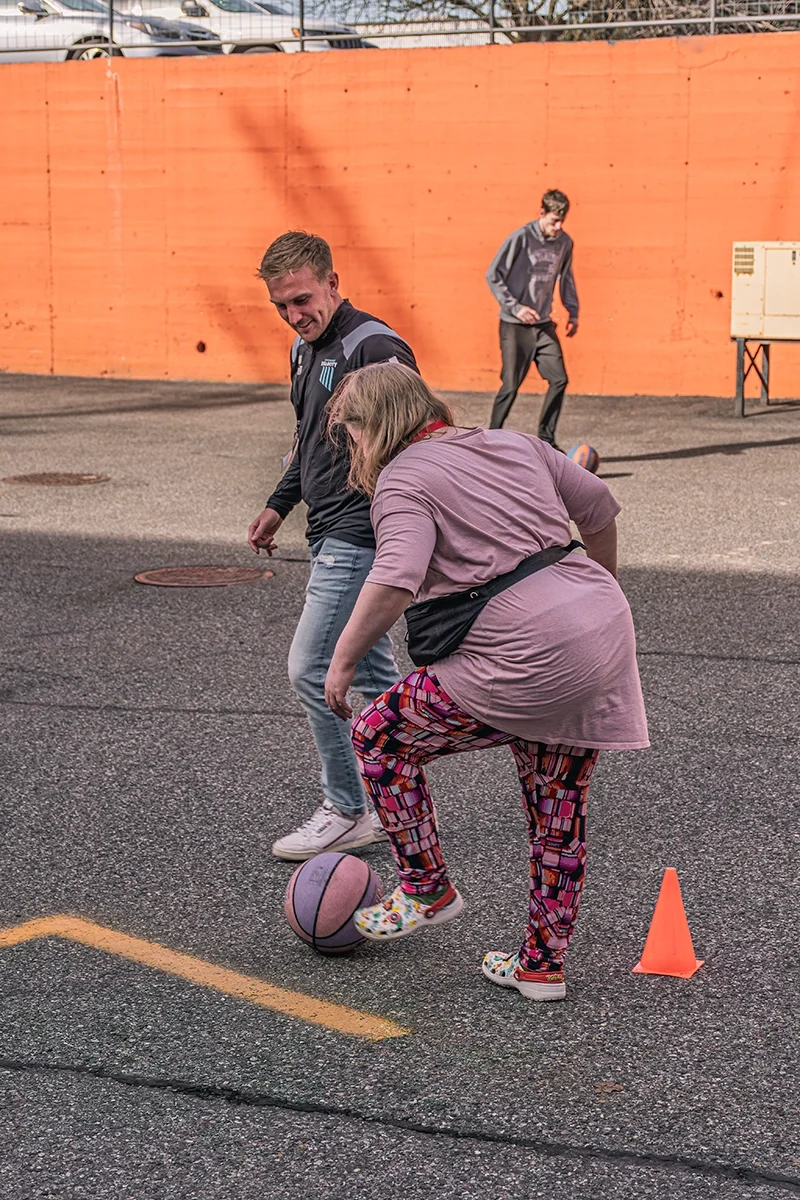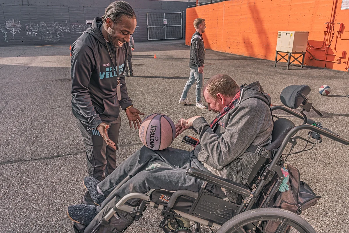 Velocity athletes showed members how to dribble a ball around cones, juggle a ball in place, and aim a ball so it hits a cone when kicked. Everyone got a turn; Miller, Meredith, and Waldeck offered steady coaching that helped build members’ confidence, and many were soon maneuvering the balls on their own. John-Brown made sure everyone, regardless of ability, was included by taking time to play basketball with one member who uses a wheelchair. That simple moment of connection made a clear, memorable impact, as shown in the member’s wide grin.